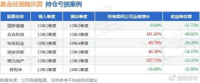 大成基金魏庆国管理的大成精选增值混合A基金在15年2季度买入国新健康,在持有1个季度后在15年3季度卖出。持有期间的估算收益率为-51.72%,持有期间国新健康在2014年到2015年的年报营业总收入降幅为0.64%。