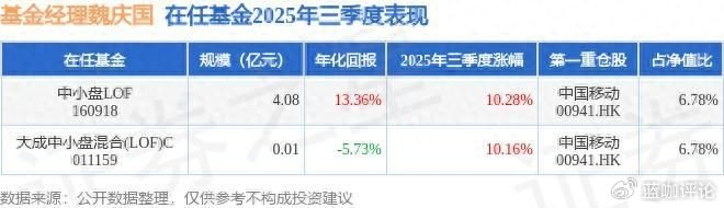证券之星消息,截止2025年三季度末,大成基金魏庆国旗下共管理2只基金,本季度表现最佳的为中小盘LOF(160918),季度净值涨10.28%。