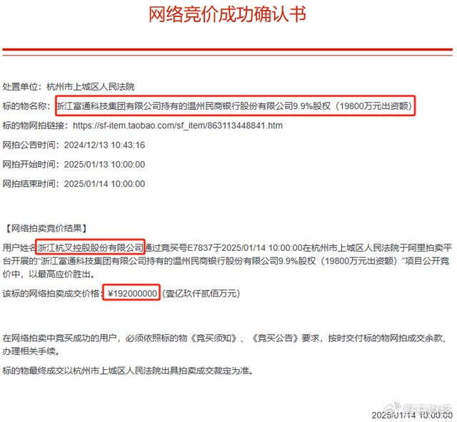 2025年1月13日10点,浙江富通科技持有的温州民商银行9.9%股权(1.98亿元出资额)在阿里拍卖平台开拍,随即被杭叉控股以1.92亿元拍下,而该笔股权此前评估价、起拍价均为1.92亿元。