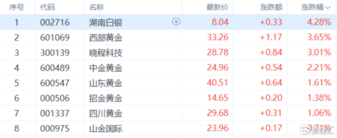 贵金属板块涨幅居前,湖南白银涨超4%,西部黄金、晓程科技涨超3%,中金黄金、山东黄金、招金黄金、四川黄金等多股跟涨。