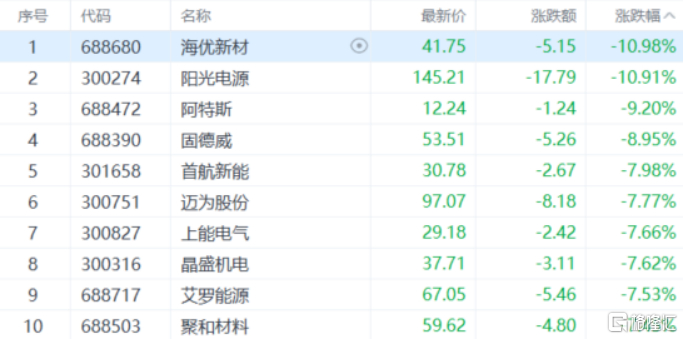 光伏设备板块下跌,海优新材、阳光电源跌超10%,阿特斯跌超9%,固德威、首航新能、迈为股份等多股跟跌。