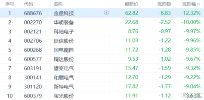 电网设备板块股下跌,华明装备10cm跌停,金盘科技跌超12%,科陆电子、良信股份、国电南自、精达股份等多股跟跌。