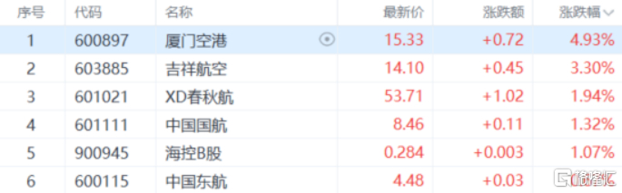 航空机场股上涨,厦门空港涨超4%,吉祥航空涨幅超3%,XD春秋航、中国国航、海控B股、中国东航等多股跟涨。