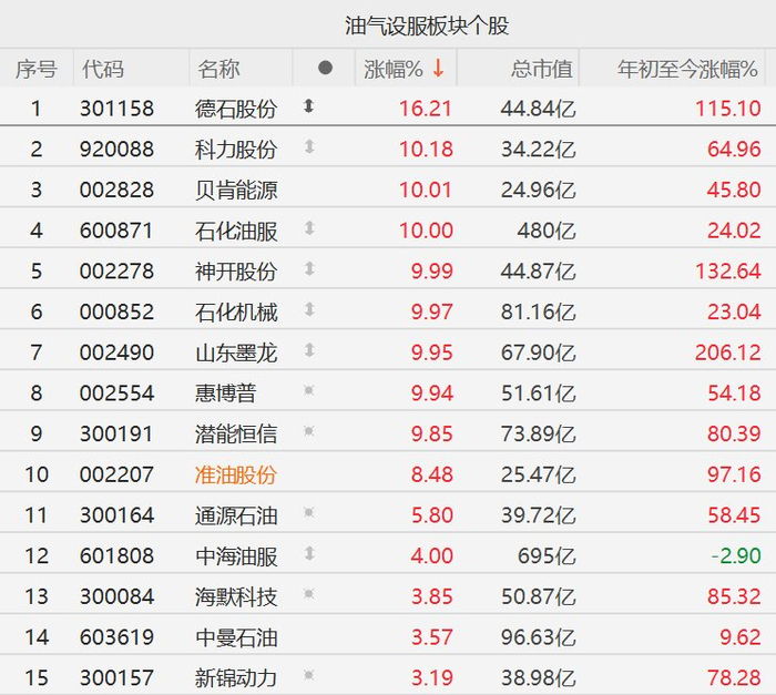 格隆汇10月22日|A股市场油气设服股走强,其中,德石股份涨超16%,科力股份涨超10%,贝肯能源、石化油服、神开股份、石化机械、山东墨龙、惠博普10CM涨停,潜能恒信涨超9%,准油股份涨超8%,通源石油涨超5%。