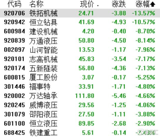 工程机械板块走低,铁拓机械跌超13%,建设机械跌超8%,厦工股份、山河智能、铁建重工纷纷回调。