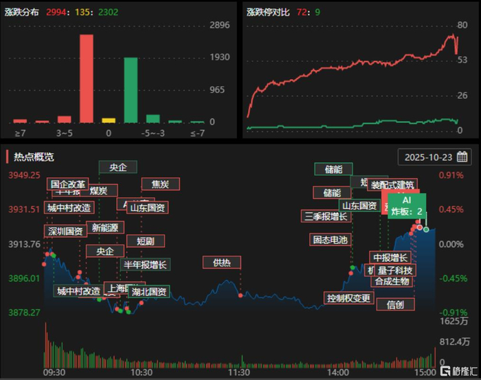 10月23日,A股三大指数早盘震荡走低,尾盘拉升集体翻红。截至收盘,沪指涨0.22%,深证成指涨0.22%,创业板指涨0.09%。全市场成交额1.66万亿元,较前一交易日缩量295亿元,近3000股上涨。