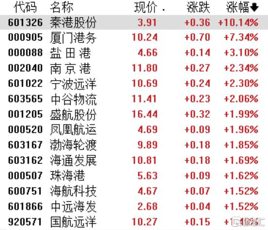 港口运输板块上扬,秦港股份涨停,厦门港务涨超7%,盐田港涨超3%,南京港、宁波远洋、凤凰航运、珠海港、中远海发纷纷上涨。