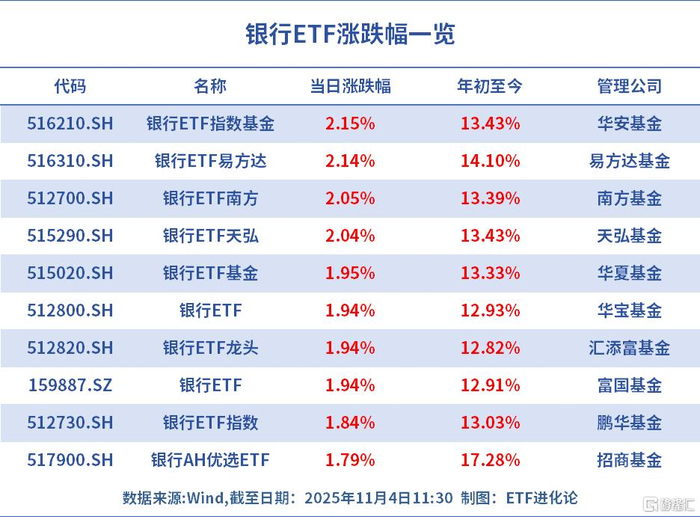 盘面上,银行板块走强。银行ETF指数基金、银行ETF易方达、银行ETF南方、银行ETF天弘涨超2%;银行ETF基金、银行ETF、银行ETF龙头、银行ETF指数、银行AH优选ETF涨超1.7%。