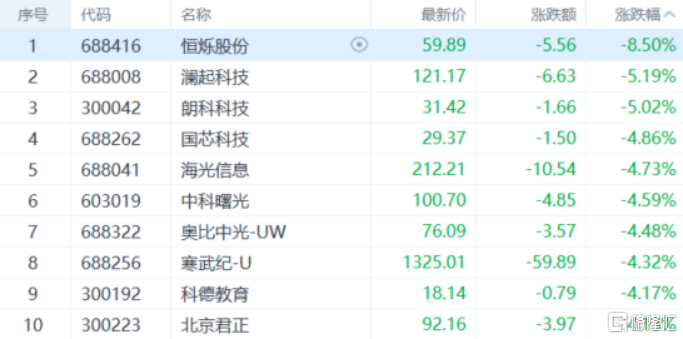 AI算力芯片板块下挫,恒烁股份跌超8%,澜起科技、朗科科技跌超5%,国芯科技、海光信息、中科曙光、奥比中光-UW等多股跟跌。