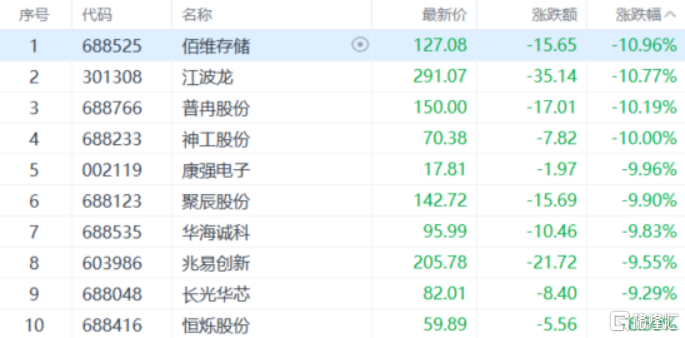 半导体板块下跌,易佰维存储、江波龙、普冉股份等超10%,康强电子、聚辰股份、华海诚科、兆易创新、长光华芯等多股跟跌。