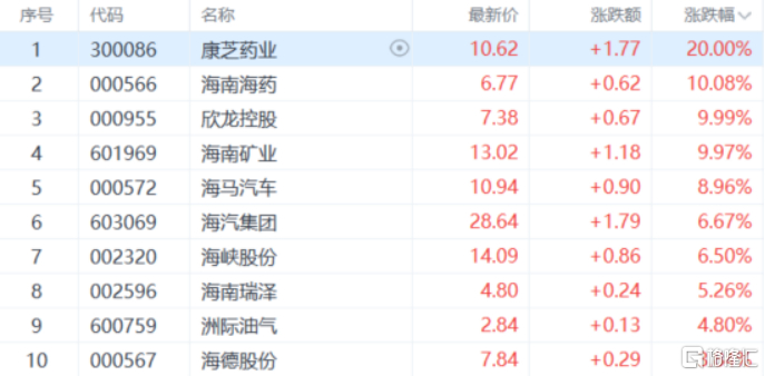 海南板块爆发,海南矿业、康芝药业等多股涨停,海马汽车涨超8%,海汽集团、海峡股份涨超6%,海南瑞泽、洲际油气等多股跟涨。