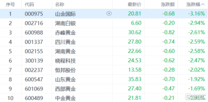 贵金属板块下跌,山金国际跌超3%,湖南白银、赤峰黄金、四川黄金、湖南黄金、晓程科技、恒邦股份、山东黄金等多股跟跌。