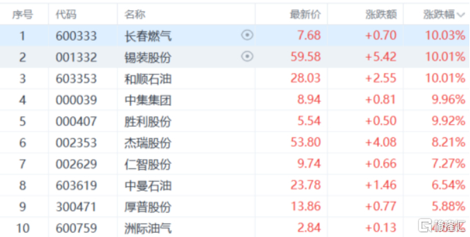 油气设备服务板块走高,长春燃气、锡装股份、和顺石油等多股涨停,中集集团、胜利股份涨超9%,杰瑞股份、仁智股份、中曼石油、厚普股份等多股跟涨。