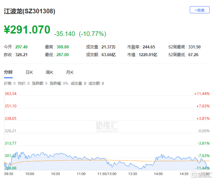 江波龙下跌10.77%,报收291.07元。消息面上,铠侠控股公布第二财季调整后净利润同比骤降超60%,拖累美国同行闪迪、西部数据、希捷科技和美光科技股价全线重挫。