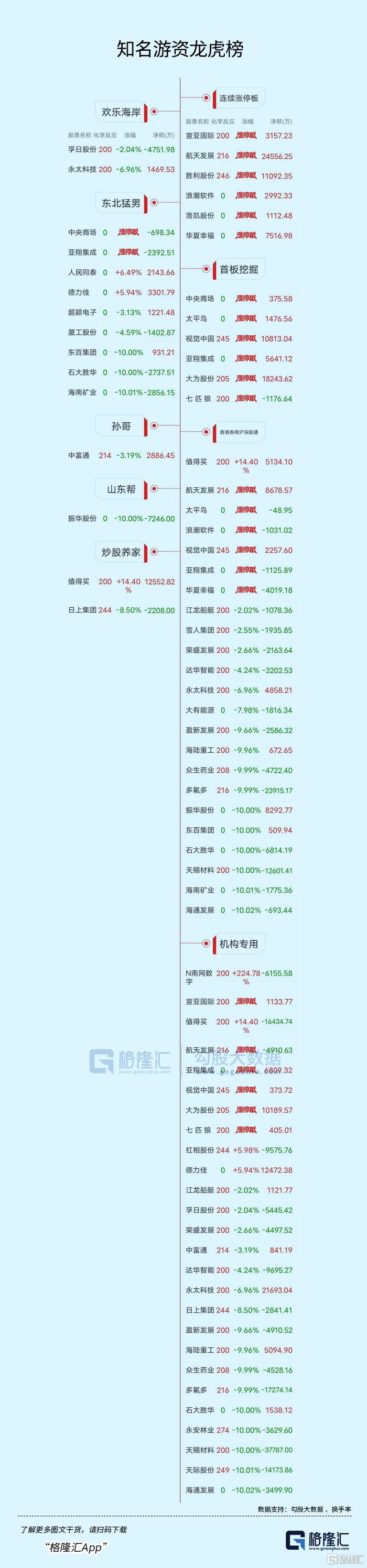 龙虎榜单日净买入额前三为航天发展、永太科技、大为股份,分别为2.46亿元、2.21亿元、1.82亿元。