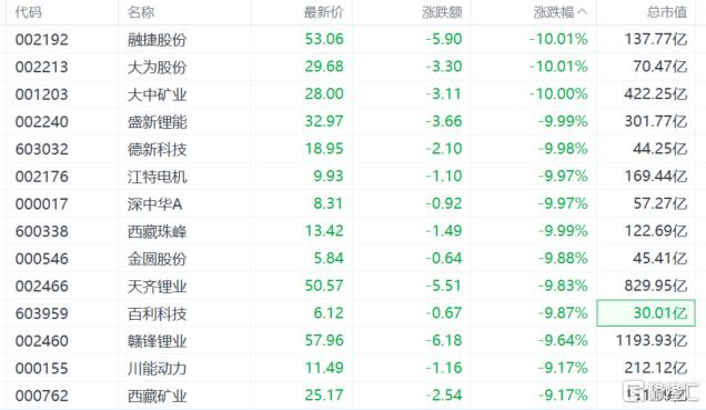 截至发稿,A股融捷股份、大为股份、大中矿业、盛新锂能、江特电机等跌停,天齐锂业、赣锋锂业、西藏矿业、西藏珠峰等大超9%。