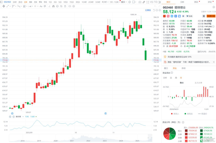 截至发稿,赣锋锂业H股大跌近8%报46.88港元;A股大跌9.39%报58.12元,总市值1198.23亿元。