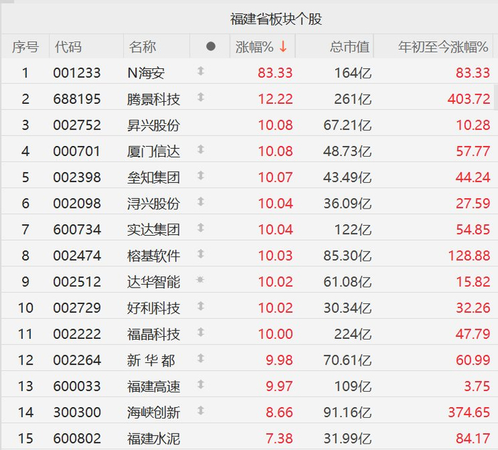 格隆汇11月25日|A股市场福建股今日表现强势,其中,腾景科技涨超12%,昇兴股份、厦门信达、垒知集团、浔兴股份、实达集团、榕基软件、达华智能、好利科技、福晶科技、新华都、福建高速10CM涨停,海峡创新涨超8%,福建水泥涨超7%。