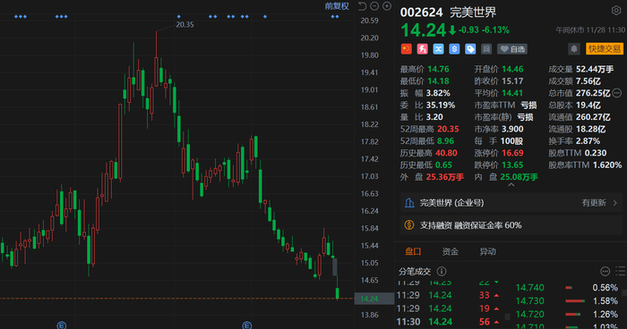 格隆汇11月28日|完美世界(002624.SZ)跌超6%,报14.24元创近4个月新低,总市值276亿元。消息上,完美世界发布股份减持公告,股东池宇峰拟减持公司股份不超过3297.95万股,减持比例不超过公司总股本的1.7%。按11月27日收盘价15.147元/股计算,池宇峰套现金额或达5亿元。