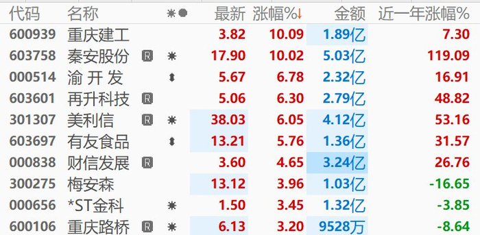 格隆汇11月28日|重庆本地股午后异动拉升,重庆建工、秦安股份涨停,财信发展、渝开发、重庆路桥、中设咨询等冲高。消息面上,重庆市人民政府印发《重庆市要素市场化配置综合改革试点行动方案》,其中提出,加快发展资本市场,推动上市公司并购重组和再融资,优化存量用地盘活机制。有序推进盘活存量商品房转为保障性住房改革。