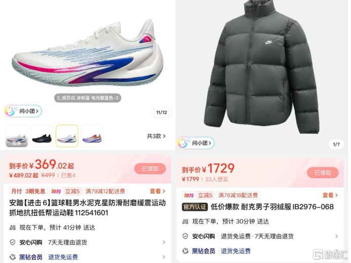 ▲闪购耐克、安踏等大牌可获退货免运费。美团闪购方面介绍,针对消费者买服饰鞋帽时常见的退换货需求,平台与多家运动、服饰类头部品牌联合,上线了退货免运费服务。目前美团黑金、黑钻会员用户购买带有七天无理由退货服务的商品时,可获此服务。相较传统电商,用户无需自费发快递,只需向平台官方提出申请、选择'美团取退',待审核通过后,骑手将上门取货,帮助用户实现最快30分钟免费取退。在此基础上,迪卡侬、安踏、滔搏、森马、361°、热风、快鱼、都市丽人、海澜之家、松山棉店、骆驼、三福、特步、柒牌等品牌联合美团闪购,全部门店面向全体消费者开放退货免运费服务。目前,已有超过50家品牌、2万余家门店上线该服务。