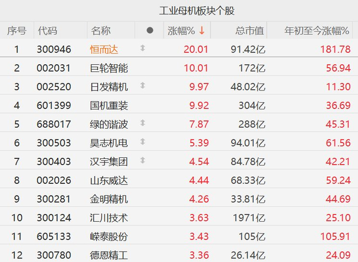 格隆汇12月4日|A股市场工业母机板块走强,其中,恒而达20CM涨停,巨轮智能、日发精机、国机重装10CM涨停,绿的谐波涨超7%,昊志机电涨超5%,汉宇集团、山东威达、金明精机涨超4%。