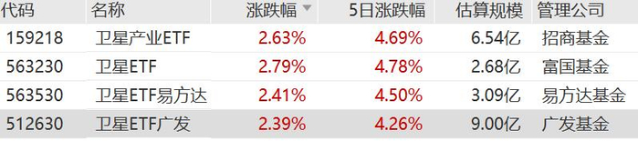 商业航天概念持续活跃,中国卫星涨停,卫星产业ETF、卫星ETF、卫星ETF易方达、卫星ETF广发涨超2%。