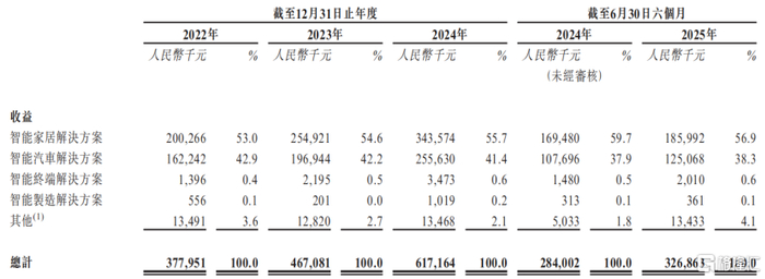 关键财务数据,来源:招股书按下游应用场景来划分,智能家居解决方案是公司的主要收入来源,2025年上半年收入占比约56.9%;其次是智能汽车解决方案,2025年上半年收入占比约38.3%;来自智能终端解决方案及智能制造解决方案的收入占比不足1%。