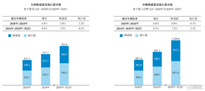 同期,全球及中国执行器市场分别由2020年的约2621亿美元及人民币3945亿元增长至2024年的约3205亿美元及人民币4991亿元。
