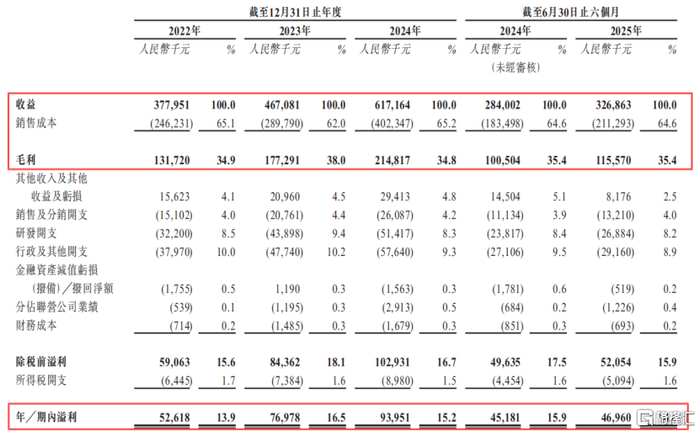 2022年、2023年、2024年及2025年1-6月(报告期),公司的收入分别为3.78亿元、4.67亿元、6.17亿元、3.27亿元,净利润分别为5262万元、7698万元、9395万元、4696万元,毛利率分别为34.9%、38%、34.8%、35.4%。