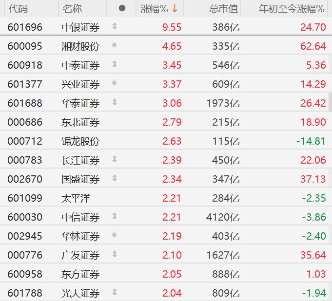 格隆汇12月5日|A股市场券商股集体拉升,其中,中银证券逼近涨停,湘财股份涨超4%,中泰证券、兴业证券、华泰证券涨超3%。