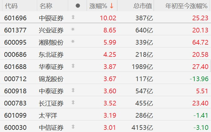 格隆汇12月5日|A股券商股涨幅进一步扩大,其中,中银证券涨停,兴业证券涨超8%,湘财股份涨超5%,东北证券涨超4%,华泰证券、锦龙股份、中泰证券、长江证券、太平洋、中信证券涨超3%。