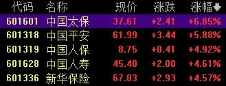 保险板块午后大涨,中国太保涨超6.85%,中国平安涨近6%,中国人保涨近5%。