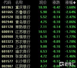 银行板块走低,重庆银行跌超3%,齐鲁银行、瑞丰银行、青岛银行跌超2%。