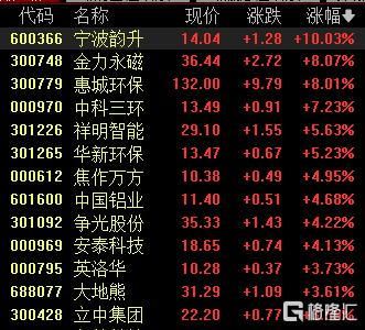 稀土永磁板块上涨,宁波韵升涨停,惠城环保、金力永磁涨超8%,中科三环涨超7%。