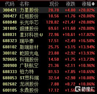 商业航天板块多股涨停,力星股份、红相股份、长光华芯、超捷股份20cm涨停,星环科技涨超17%。