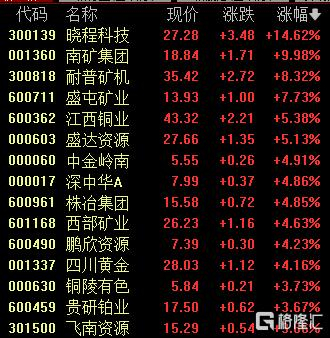 黄金概念走高,晓程科技涨超14%,南矿集团涨停,耐普矿机涨超8%,盛屯矿业涨超7%。