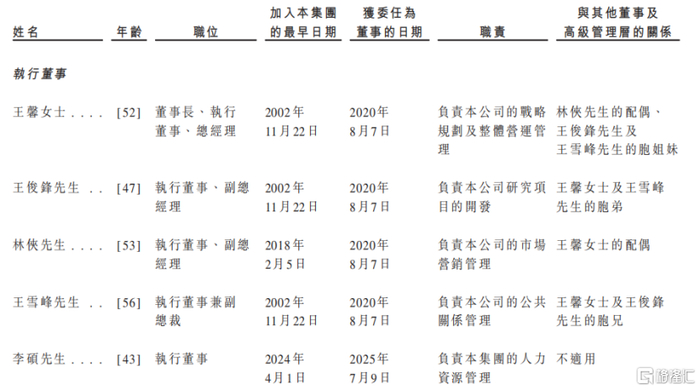 王馨的弟弟王俊锋先生,以及哥哥王雪峰先生均在公司任执行董事,其中王俊锋主要负责研究项目的开发,王雪峰负责公共关系管理。