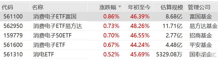 生益电子、工业富联涨超6%,带到消费电子ETF易方达、消费电子ETF富国、消费电子50ETF、消费电子ETF、消电ETF上涨,消费电子ETF易方达、消费电子ETF富国、消费电子50ET年内涨幅超45%。