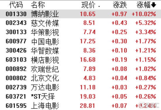 影视板块部分上涨,博纳影业涨停,慈文传媒涨超5%,华策影视涨超3%,中国电影、横店影视、欢瑞世纪涨超1%。