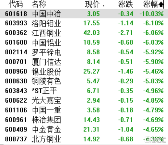 小金属概念股走低,中国中冶跌停,洛阳钼业、江西铜业、中国铝业跌超6%,罗平锌电、锡业股份、铜陵有色跌超5%。