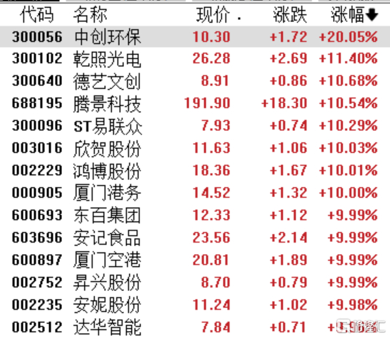 福建股继续上涨,中创环保20CM涨停,鸿博股份、厦门港务、东百集团、安记食品等10CM涨停。