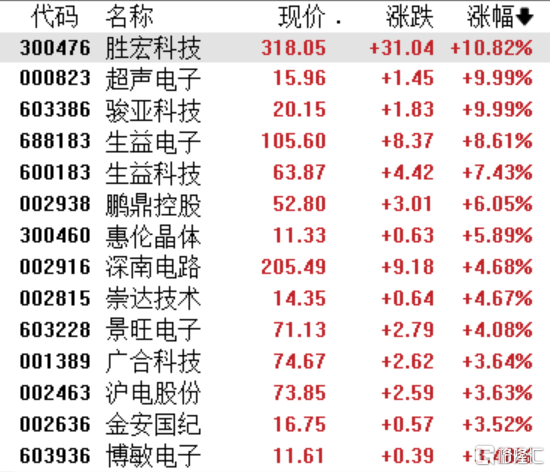 元件板块活跃,骏亚科技、超声电子涨停,胜宏科技涨超10%,深南电路、崇达技术、景旺电子涨超4%。
