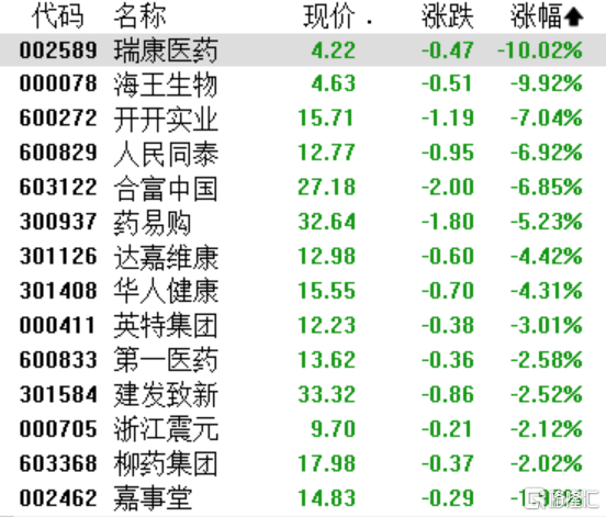 医药商业板块集体下挫,瑞康医药、海王生物跌停,开开实业跌超7%,人民同泰、合富中国跌超6%,药易购、华人健康、第一医药跟跌。