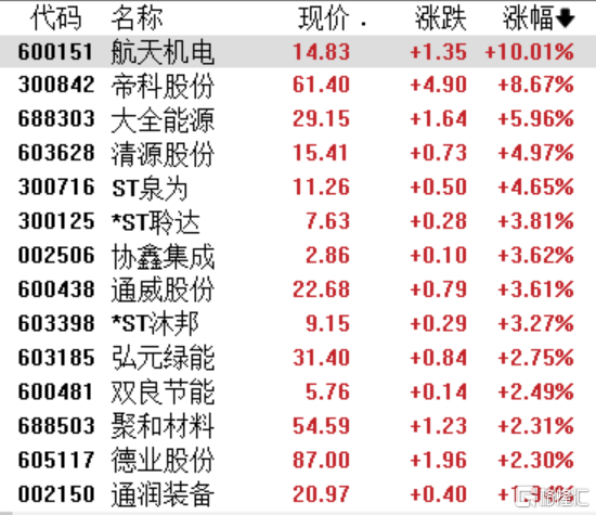 光伏股午后一度出现一波拉升走势,航天机电涨停,帝科股份涨超8%,大全能源涨近6%,协鑫集成、通威股份、双良节能等跟涨。