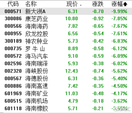 海南板块大幅调整,新大洲A跌停,康芝药业、海南海药、欣龙控股跌超7%,神农种业、罗牛山、海马汽车、海南瑞泽等纷纷下跌。