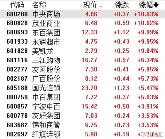 零售板块持续走强,中央商场、茂业商业、东百集团等涨停,友阿股份、广百股份、国光连锁、中百集团涨超5%。
