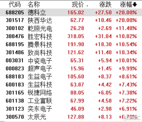 CPO板块再度全线爆发,德科立、陕西华达20CM涨停封板,乾照光电、腾景科技涨超10%,中瓷电子等涨停封板。