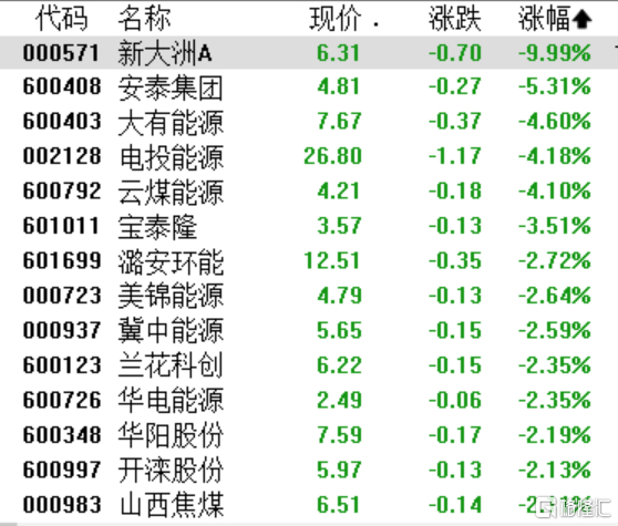 煤炭板块飘绿,新大洲A跌停,安泰集团跌超5%,大有能源、电投能源、云煤能源跌超4%,潞安环能、美锦能源、冀中能源、华电能源跌超2%。