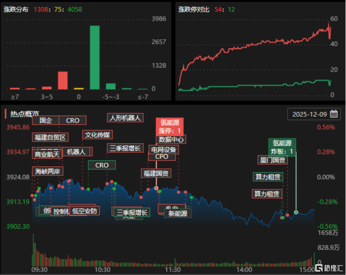 12月9日,A股三大指数涨跌不一,沪指跌0.37%,深证成指跌0.39%,创业板指涨0.61%。全市场成交额1.92万亿元,较前一交易日缩量1340亿元,超4000股下跌。